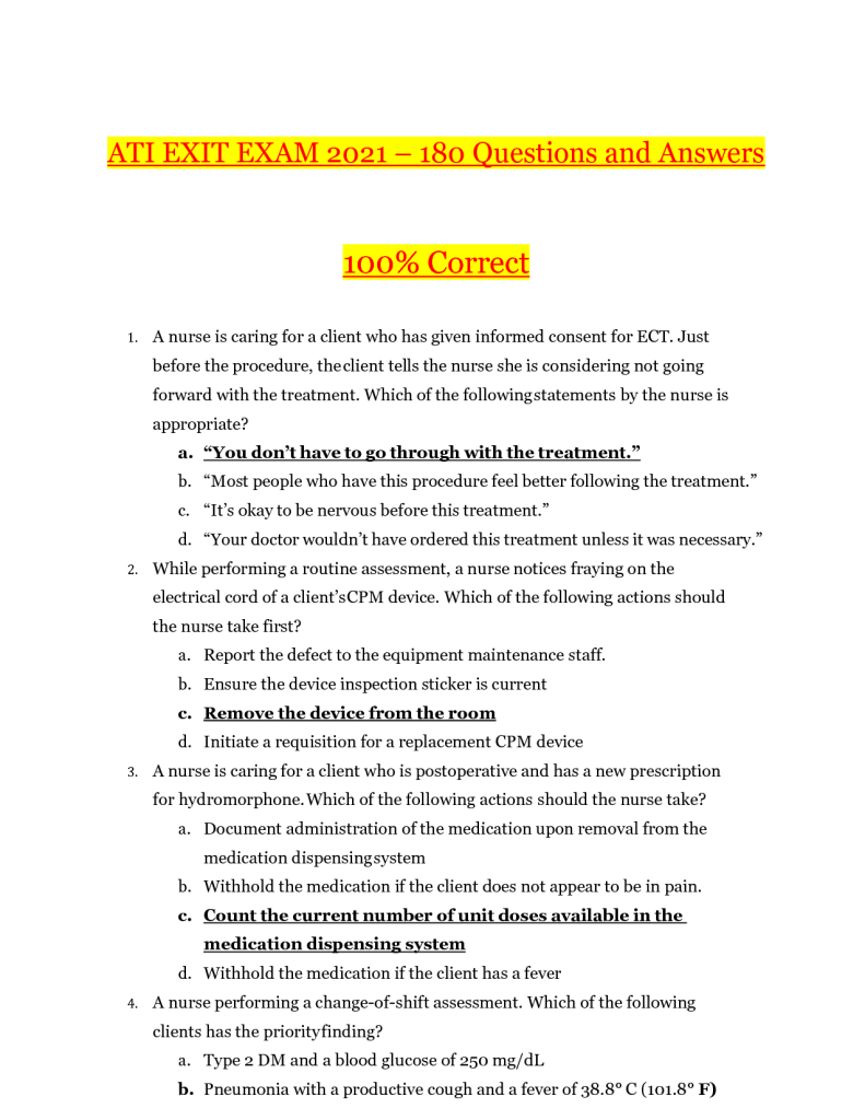 In this article, we have compiled a list of 180 ATI Exit Exam questions to help nursing students prepare for the exam. By practicing with these questions, students can gain a better understanding of the content and format of the exam, as well as identify areas where they may need to focus their studying. Take the time to review and answer these questions to improve your chances of passing the ATI Exit Exam and becoming a licensed nurse.